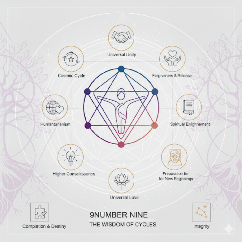 The final number of the single-digit cycle, 9 represents the culmination of all previous lessons and energies. It’s a powerful transition of completion, universal love, and preparation for a new beginning. It embodies the wisdom of a full cycle and selfless humanitarian service.