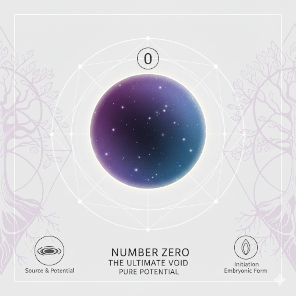 Its Vibration and Storytelling Role: Zero is the number of pure potential, the source from which everything emerges and to which it eventually returns. It’s the great paradox – the “no-thingness” that contains all possibilities. Zero represents the unmanifested, the great mystery before the first step of creation (1). It’s the cosmic egg, the blank canvas, and the ultimate void. When it appears with another number (like 10), it magnifies that number’s power, signifying that the number’s essence is being channelled directly from the ultimate source, the Divine Void itself. Encountering 0 is a powerful reminder of infinite possibility and a clean slate.