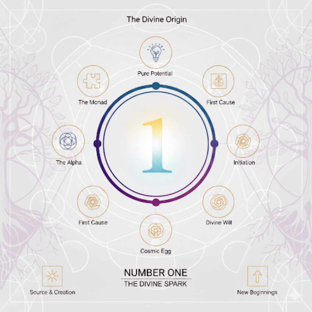 The number 1 represents the singularity, the unmanifested point of all potential. It is the beginning, the primal cause, the ultimate source from which all other numbers and all of creation will emerge. Think of it as the first thought in the mind of the Divine.