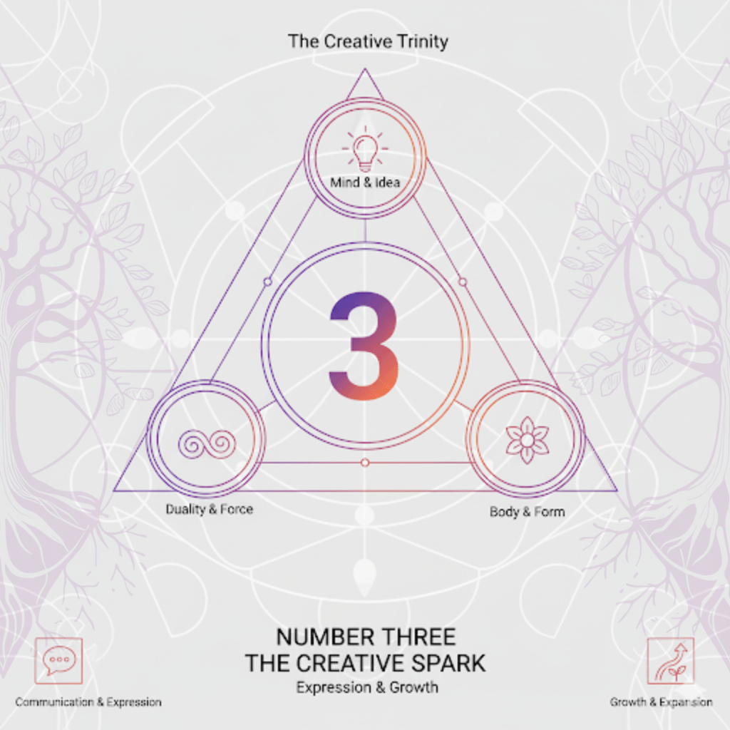 Number 3 is the culmination of the first two numbers. From the singular point (1) and the duality of two (2), 3 emerges as a third force, creating a synthesis. It’s the child born of the union, the resolution of a paradox. It represents the first stable form, structure, and the power of creative expression.