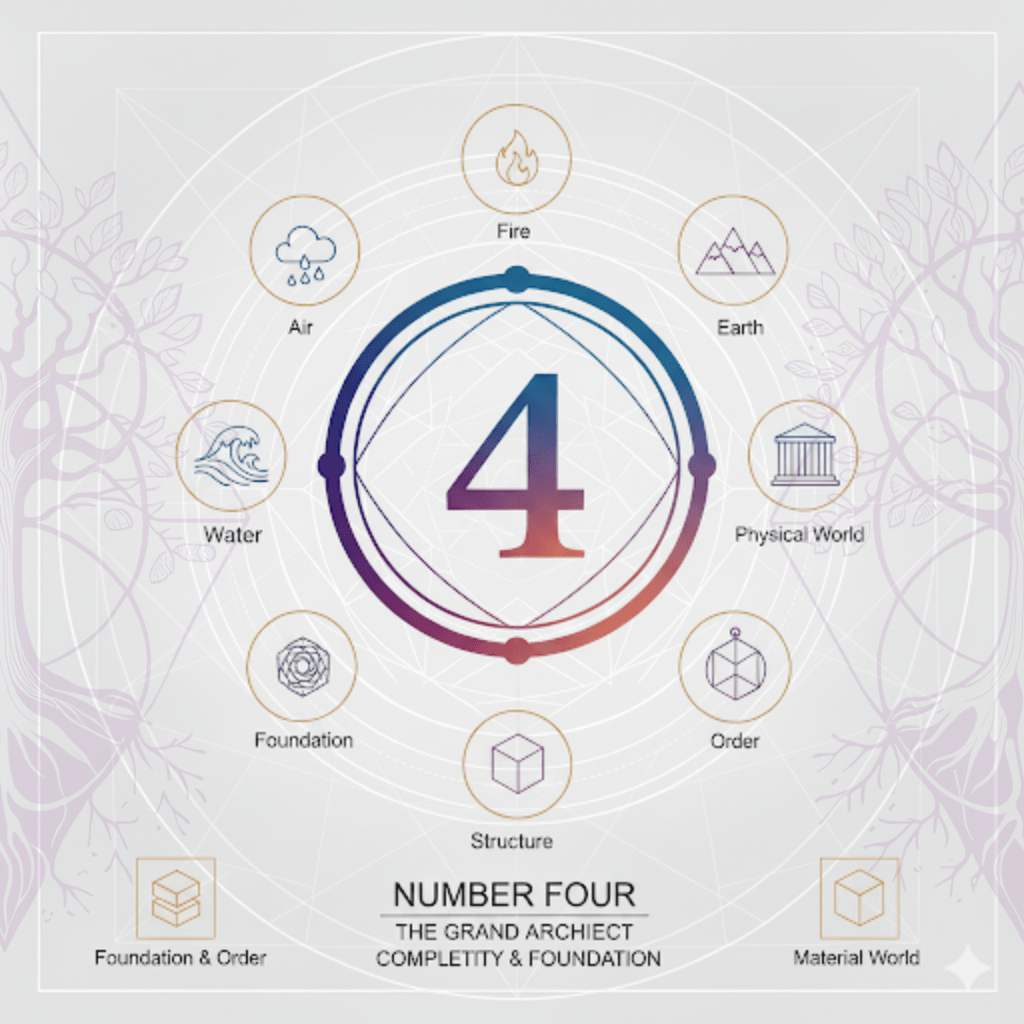 Number 4 is the first truly material number. After the synthesis of the trinity (3), the energy of creation is solidified and grounded into a physical form. It’s the number of the four elements and directions, representing consciousness manifesting into the physical world, bringing structure, order, and stability.