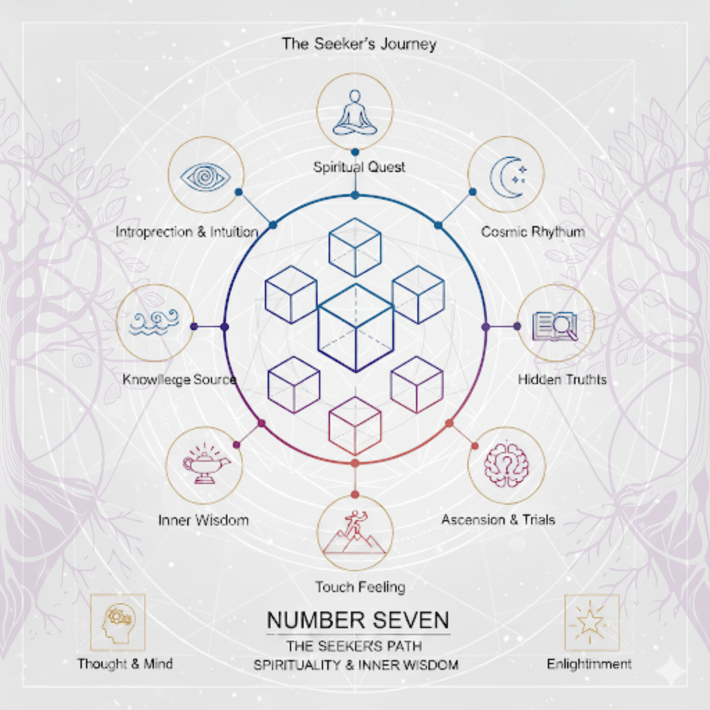 After social harmony (6), 7 turns inward, seeking deeper truths. It’s the number of introspection, spiritual quests, and the pursuit of hidden knowledge, marking a complete cycle of development from the physical to the spiritual.