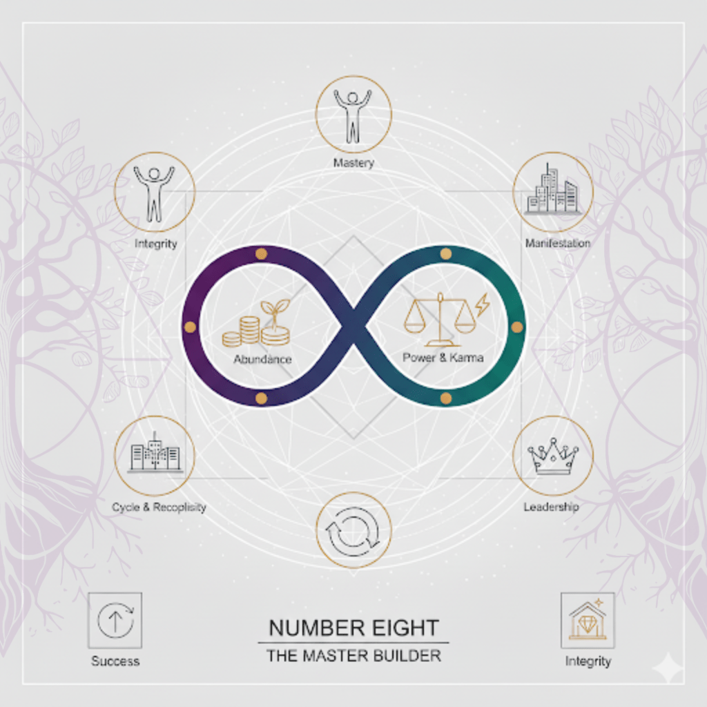 - Universal or Mystical Law Correlation: The Law of Cause and Effect (Karma). This law states that every action, thought, and word has a consequence. Number 8 is about understanding and mastering this law.