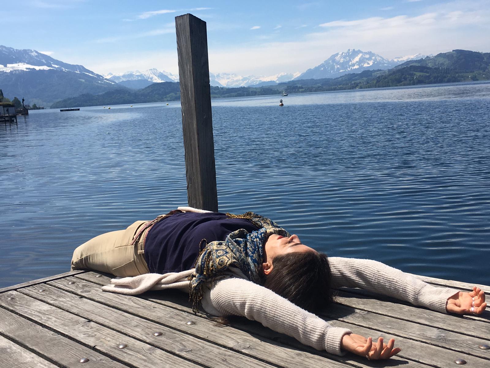 The presence of the Alps adds a touch of grandeur and awe-inspiring beauty to the scene, showcasing nature’s majestic creations. This moment of blissful relaxation by the water’s edge is a reminder of the simple pleasures that nature offers and the stunning landscapes that surround us.