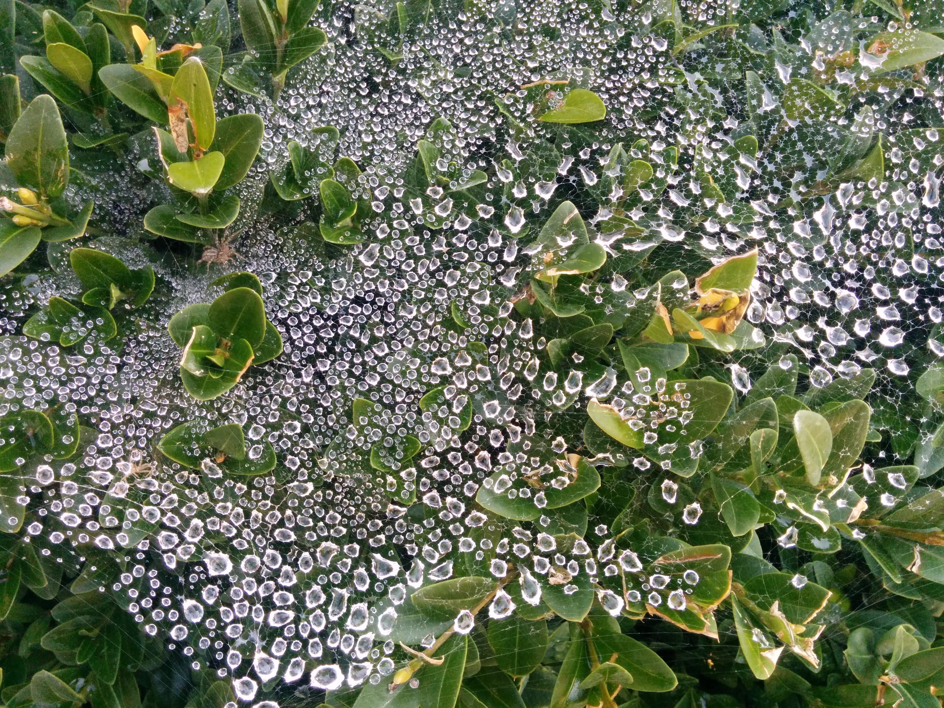 This image showcases the delicate and intricate beauty of nature as tiny drops of water are captured by spiderwebs woven through a bush. Each drop glistens in the light, creating a mesmerizing scene that highlights the artistry and complexity found in small, often overlooked details.