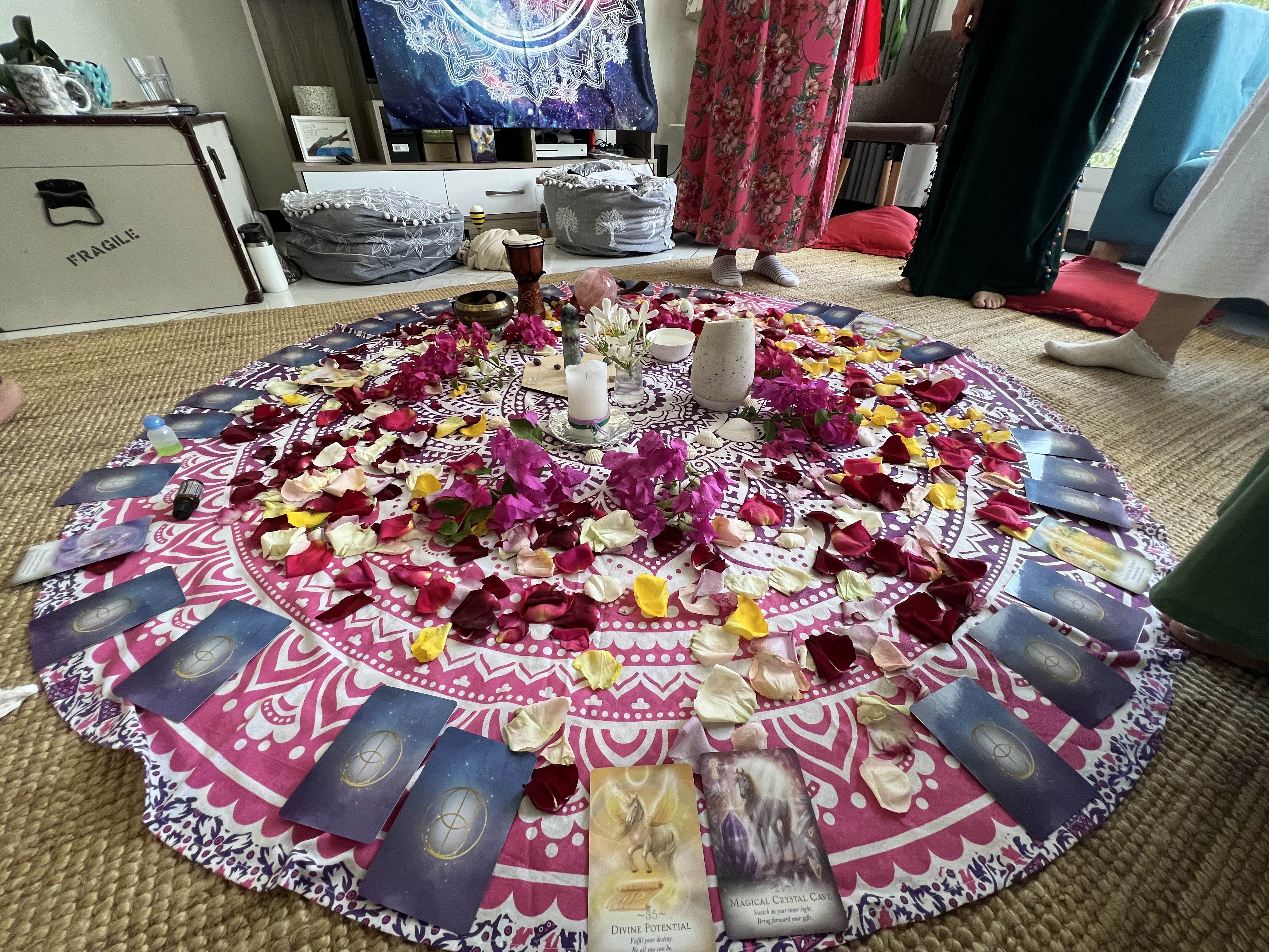 This image captures a beautifully crafted altar dedicated to Mother Earth, created within a women’s circle gathering. The altar is adorned with symbolic representations of the four elements—earth, air, fire, and water—honoring the interconnectedness of all life and the sacredness of nature.